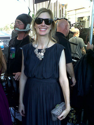 I was just excited to get the dress to zip up over my ever-growing belly. (Yay, I’m 20 weeks — halfway there!). I broke out my black glittery Jimmy Choo heels that I bought for last year’s Oscars and then borrowed a beautiful sparkly J. Crew statement necklace, bag and wrap from our wardrobe team at the show.