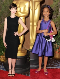As for the youngest nominee in Oscar’s 85-year history, 9-year-old Quvenzhane Wallis wore David Meister to the luncheon just as she has on several occasions recently. She made sure to bring her signature accessory: a puppy-shaped purse! She told us why she loves them so much.