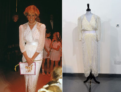 There’s also a pretty white chiffon cocktail number by ‘Zandra Rhodes’ that Diana wore to a benefit event in London in 1987. The pleated bodice is studded with pearl beads and sequins; the waistband features quilted, top-stitched white satin over the draped skirt edged with pink crystals and white pearlised beads.